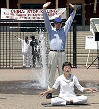 2004年7月4日,圣地亚哥的法轮功学员继上午参加了洛杉矶亨廷顿滩第100届国庆游行以及当地的斯克里普司牧场国庆日游行后。