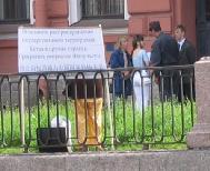 2004年7月7日下午,俄罗斯圣彼得堡法轮功学员在中国领事馆门前展开横幅,抗议南非雇凶杀人事件,和江氏流氓集团向海外输出国家恐怖主义,要求停止迫害法轮功。