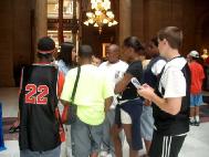 展览结束前,来了一对黑人兄弟。原来,弟弟是该大楼的清洁工,看到学员们炼功那样祥和,觉得太好了,就告诉他哥哥。哥哥执意要学这个好功法,所以就赶在结束前来索要资料和询问炼功点情况。看着他们离去的背影,学员们也感动了,世上还有多少有缘人在等待啊。