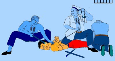 图解一:发生在四川绵阳新华劳教所内,大法弟子在抵制邪恶的迫害中,恶警惯用的手段就是“扎警绳”,凶狠扒光大法弟子的上衣,用小指粗绳子死劲扎進手臂皮肉里,反剪双手死劲上提,使受刑者剧烈疼痛难忍,按劳教所“规定”此刑不得超过15分钟,否则双手臂将残废,一般松开绳子时,被绳子勒过的地方皮几乎都破了,浸出鲜血,双手臂麻木,没有知觉,一般要十多二十天才能恢复正常,有的甚至要两、三个月才恢复,严重点的就直接是残废了。