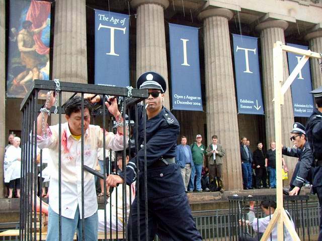 游行开始前,英国法轮大法学会举行了新闻发布会。英国资深外交官瑟罗勋爵、欧洲法轮功之友负责人约翰迪、曾在中国国内遭受酷刑折磨的法轮功学员等发言谴责江泽民对法轮功的镇压并呼吁立即停止迫害。游行于中午12点开始,三名女学员手捧“真善忍”三个大字走在队伍的最前面。跟在后面的几排学员分别举着“法轮大法”、“停止迫害法轮功”和“法办江泽民”的横幅。紧接着的是一辆展示酷刑的拖车,车头上方一名身穿白衣白裤的女学员双盘打坐展示法轮功第五套功法。拖车上数名法轮功学员在各类刑具上展示真人模拟酷刑。拖车后面紧跟着身穿白衣白裤、手捧受迫害致死学员遗像的女学员方队。最后是几名学员手举反对迫害的各式横幅。