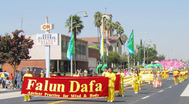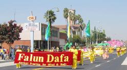 法轮功学员的队伍由舞蹈队,腰鼓队,和花车组成。学员们在花车上向观众表演五套功法。很多人被这祥和美好的气氛所吸引,在路边模仿着学员的动作。当发资料的学员走过时,他们都主动了解法轮功的消息,并感谢学员们所付出的努力。