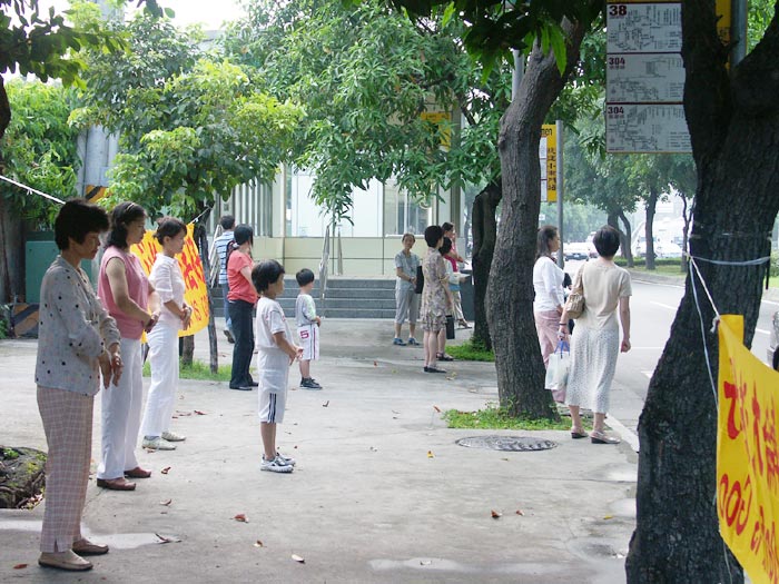 【明慧网2004年8月14日】一天我们在捷运站出口洪法炼功,一位阿嬷一看到我们炼功时的动作就跟着学,我们做叠扣小腹时,她也跟着叠扣小腹,我们做合十动作,她也合十。小弟子看到了这情景,就过去递上一份简介,阿嬷就很认真的看,不一会儿,就主动问学员有关功法的情形及哪儿可以学炼,学员们很耐心的说明,阿嬷很愉快的走了。