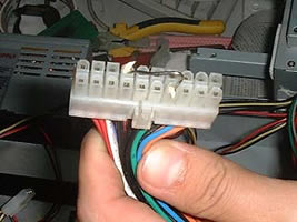 目前的电源基本都是ATX的电源,需要手工接通电源来通电工作,扣子那个方向朝下,上面那排是从左往数过去第四口,下排是从右数过来第四口,用曲别针把两个口接通: