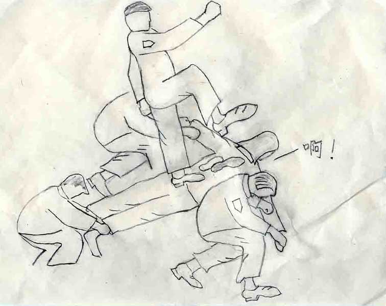 几个恶警抻开两臂、两腿将她俯卧在水泥地上。一个身高1米8多、体重200多斤的恶徒双脚离地站在她的背上,并猛烈地蹬踹(如图所示)。