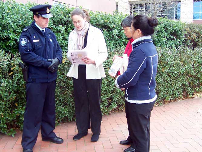 8月13日清晨才由雅典飞回悉尼的法轮功学员戴志珍,带着女儿法度也赶到了堪培拉。戴女士流着泪讲述了丈夫陈承勇因坚信真善忍和不放弃对法轮大法的信仰而在中国被迫害致死的事实。为了不使悲剧重演,她成为多个起诉江××案件的原告之一。两年半来,她带着小法度,走了近40个国家,告诉世界上善良的人她们一家的遭遇。戴女士表示,人们不应为了经济利益而保持沉默,沉默就是对这场迫害的支持和纵容。4个月前,戴女士的母亲去世了,她母亲的最后愿望是能看一看小孙女法度,但中领馆却因戴女士和法度是法轮功学员而拒发签证。更多类似的人间惨剧仍在继续发生着,戴女士呼吁所有的人们能勇敢的站出来共同制止对法轮功学员的虐杀。