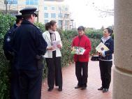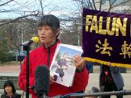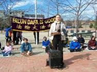 ![]() 佛学会成员Kay Rubacek在发言 | ![]() 学员在外交部外炼功 | ![]() 外交部门外 |