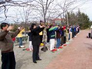 学员在外交部大楼外和平的炼功和发正念,新闻发布会于12点左右开始。