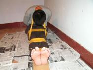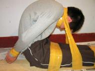 酷刑方法:被迫害的法轮功学员两腿被固定在梯子上,这里由于材料所限,用木板代替了梯子。口被封条封住是怕学员叫喊,手也被捆住,然后把脑袋强行压向腿面用胶带固定住。