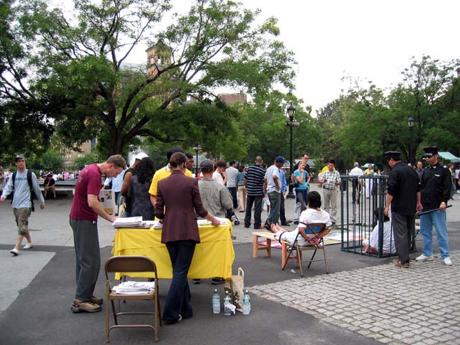 扮演被关在笼子里被绑被吊的老人已经站了一个多小时了,他儿子因炼法轮功被关押了1年半,很多酷刑他儿子都遭受过。
