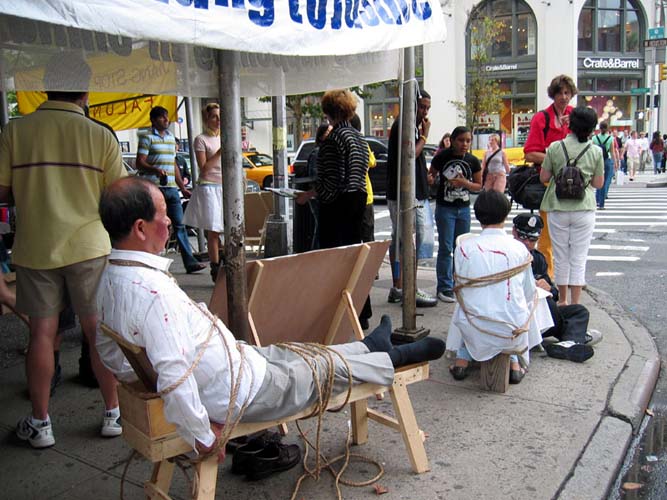 演示的酷刑中,有被警察强迫灌食的浑身被捆绑流血的妇女、有被吊起来关在笼子里满脸痛苦表情的老人、有被尖尖的竹签刺进手指正流血不止等等,旁边还有图片说明,人们看到这一幕幕惨不忍睹的画面,被惊呆了!不少人问:“这是真的吗?在那里发生?为什么要迫害?”不敢相信现在在世界上还发生着这样残忍的迫害,而且是对一群打坐修炼“真善忍”的善良好人。