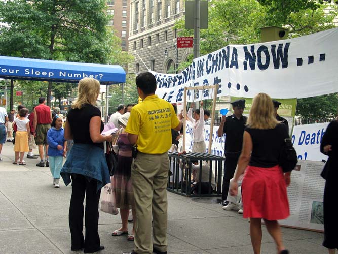 他说:“美国讲民主,允许在这里演示;在中国大陆酷刑迫害一般人不知道,只有亲戚朋友才听说过。演示只是九牛一毛。演示就是为了让美国人看到在中国大陆江泽民一伙对法轮功的谎言镇压,让人们了解真象,伸张人间正义,同时也唤醒自己的良知。让更多人了解真象,记住镇压已经在中国进行了5年,不能再下去了!不能看着让丧心病狂的江氏集团把数以万计的好人往死里整。”