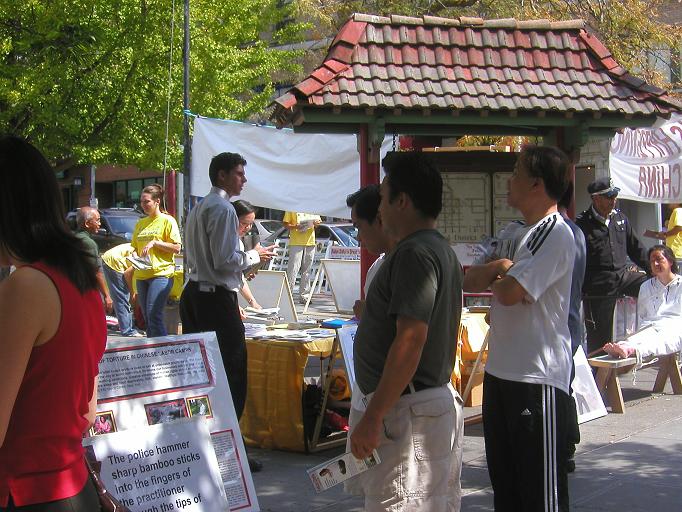 的人们络绎不绝。许多人主动拿了更多的材料回去给亲朋好友和自己工作中遇到的顾客询问。 我们不断听到这样的询问,我能做什么,我还能做什么来帮助你们?我们也利用这次机会更深入的向这里的人们讲真象。