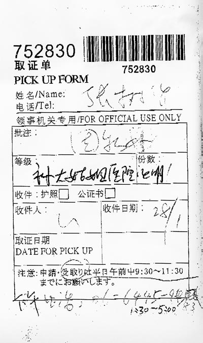 2004年1月28日,我再次来到大阪领事馆,一位姓红的领事受理了我的文件并给了我一个取证单和一个电话号码,让我一个月后打电话问一下办好了没有。
