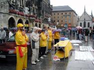 2004年8月14日,来自德国慕尼黑、斯图加特、累根斯堡和周边地区的学员聚集在慕尼黑玛琳广场,冒雨举行了“反酷刑展”,用展板和真人演示酷刑,揭露江氏政治流氓集团对中国法轮功学员的残酷迫害。