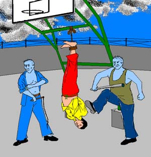 图解五:2000年发生在新华劳教所六大队三中队,警察指使吸毒劳教人员,把抵制迫害的大法弟子反捆双手倒吊在篮球架上,并辱骂、殴打大法弟子。