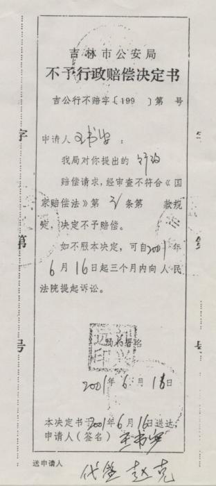 2001年6月16日,吉林市公安局作出不予行政赔偿的决定。