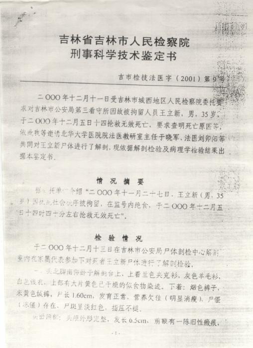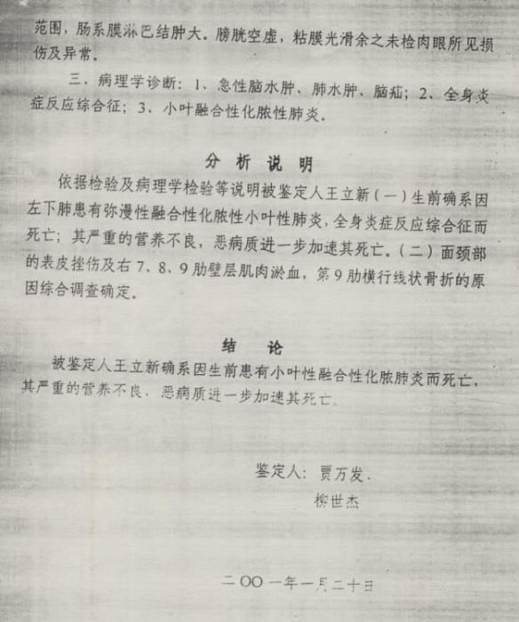 2000年12月13日,在吉林市公安局对王立新的遗体進行了解剖检验。据解剖检验结果,王立新明显消瘦,肋骨骨折和胸部淤血斑块,“左肺下叶背面大片暗紫色瘀斑”,“小肠弥漫明显变细萎陷,粘膜弥漫瘀血,升结肠粘膜大片淤血,瘀斑,回盲部较重呈暗红色,出血,长约60cm范围,肠系膜淋巴结肿大”。法医最后诊断为:1、急性脑水肿、肺水肿、脑疝;2、全身炎症反应综合症;3、小叶融合性化脓性肺炎。