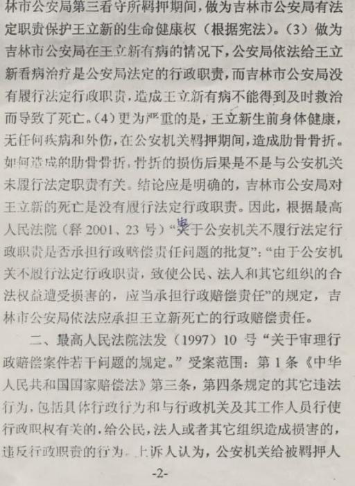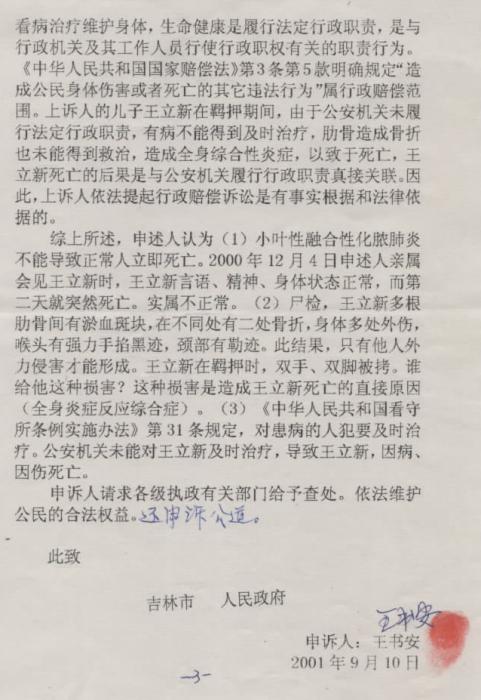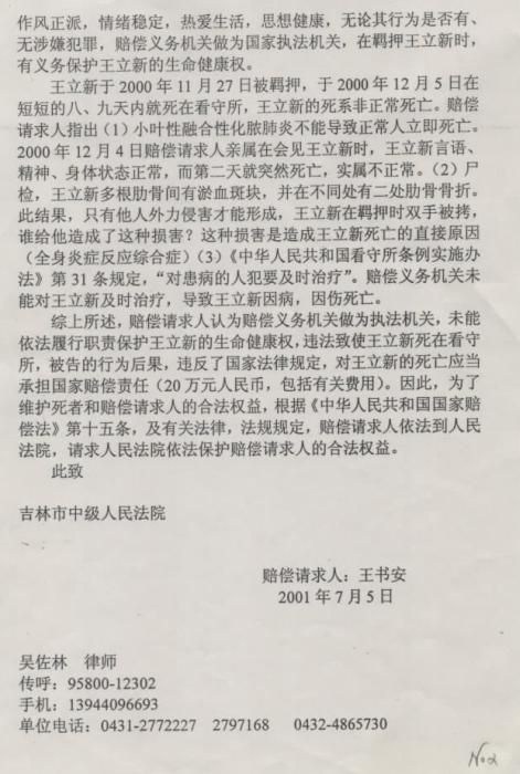 2001年7月王书安就儿子王立新在吉林市公安局看守所死亡案件,向吉林市中级人民法院提起了赔偿请求,继续要求吉林市公安局赔偿20万元人民币。