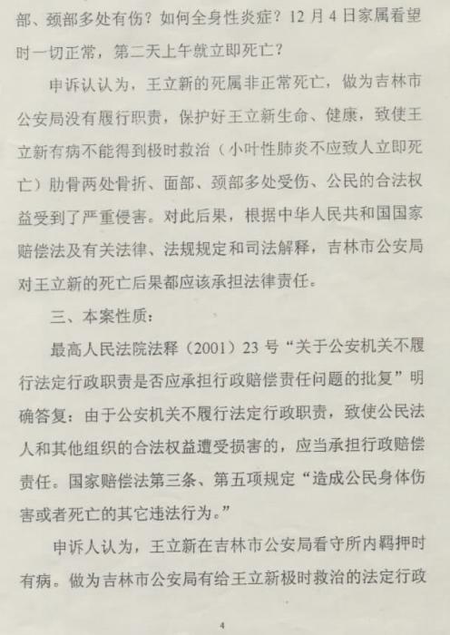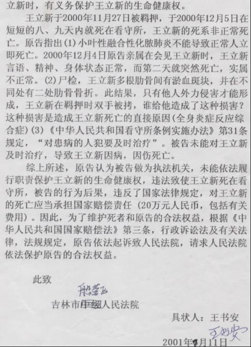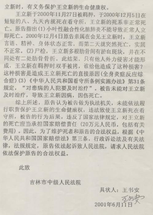 王立新于2000年11月27日被羁押,于2000年12月5日在短短的八、九天内就死在看守所,王立新的死系非正常死亡。2001年6月王立新的父亲王书安依法向吉林市中级人民法院提起了行政起诉,诉讼要求被告(吉林市公安局)赔偿20万元人民币。