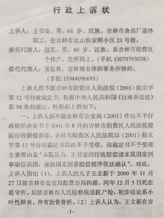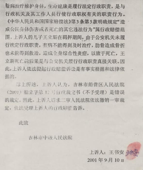 2001年9月王立新的父亲王书安向吉林市中级人民法院提起了行政上诉,继续控告吉林市公安局迫害其子。