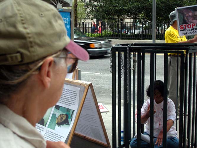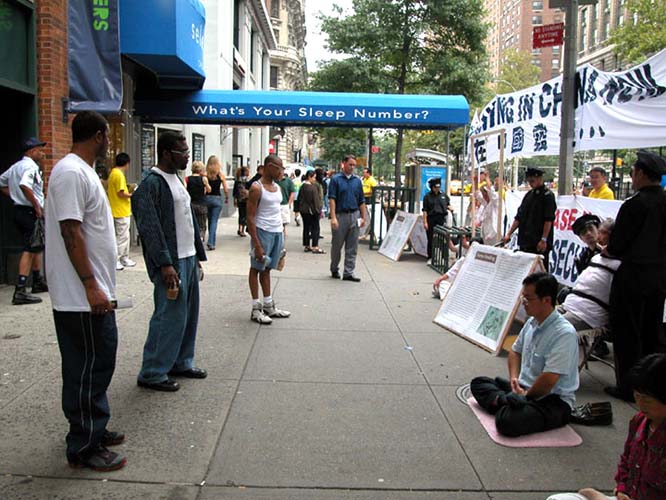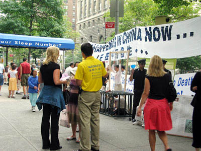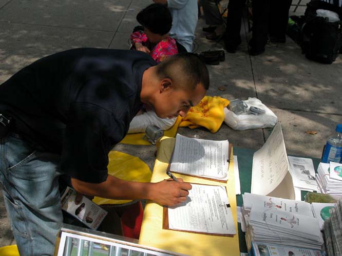 看我们的反酷刑展,纽约人哭了。一位女士在签名的一瞬间,泣不成声,与我们的大法弟子拥抱;一位男士也落了泪,还有很多人眼里含着泪;两天自愿来我们这个小组签名的就有500多。有人回去后写了给布什和中使馆的信又送来,有的回去后又打来电话告诉我们他知道的媒体的电话,有的提供能帮助我们的部门的信息。