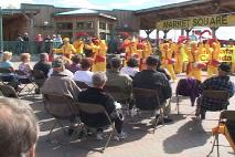 在城里绕了一圈,也看不见街上有几个人,大家心却都不急不躁,车里一片祥和的气氛,突然,见路边正在开一个露天音乐会,很多人围坐在那里,旁边还有不少孩子在等着坐游览马车。大家说就是这里了。停好了车,几位同修商量着,怎么去跟主办者沟通,希望他们能接受我们给他们表演一场。刚商量好,一个主办者匆匆的迎着我们走来,大概是我们一身金黄的打扮吸引了她,她主动走上来问我们要做什么,三两句话,没费一点劲,主办者邀请了我们做十五分钟的表演。