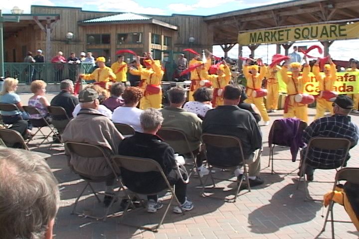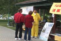 赶到SUDBURY时,头天已经赶过去的两三位同修已经把介绍大法的展台布置得非常美丽了,它坐落在一个景色十分迷人的公园的進口处,周围山清水秀、繁花似锦。看到当地CTV电视台的记者已在那里等候,同修们顾不得欣赏风景,炼功的、发资料的,打鼓的、舞狮子的,十几分钟内就样样就绪了。