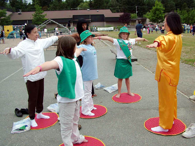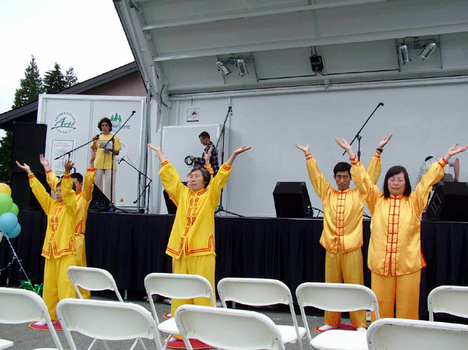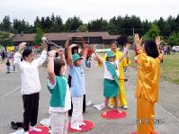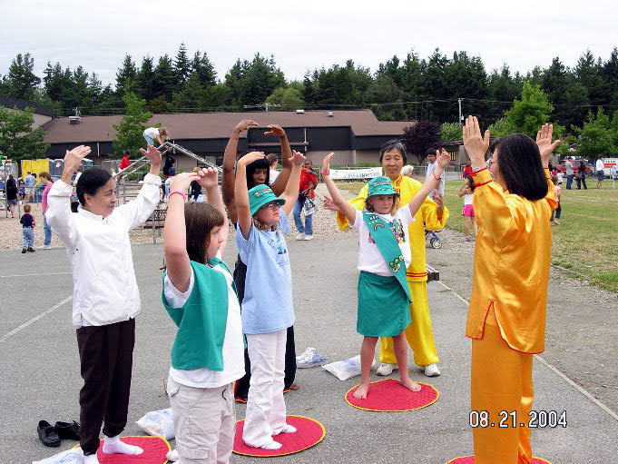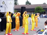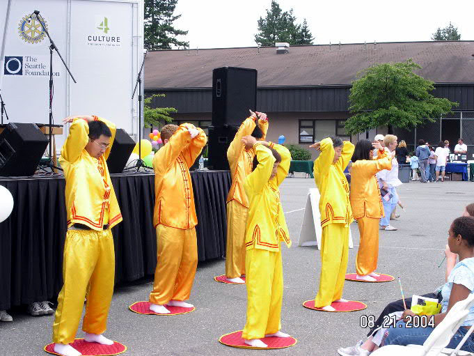 【明慧网2004年8月24日】2004年8月21日,坐落在美国西雅图北边的硕蓝城(Shoreline)迎来了该市一年一度的节庆日。法轮功学员应邀参加了游行和节庆摊位展,并向观众表演了5套功法。许多民众接到了法轮大法的相关材料。 有些人在向学员学习功法之后,希望学员能到他们的社区去建立炼功点。