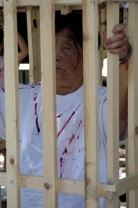 今年68岁的马女士表演的关在笼子里遭受折磨令来往行人心碎,很多人主动要法轮功真象传单。马女士4年前来美国探亲,看到以前病歪歪的女儿全变了样,不但身体好、性格也更好了,并且看到其他法轮功学员都很好,不象国内宣传的那样,很快自己就炼上了。原来的高血压、心脏病随之也不翼而飞了。