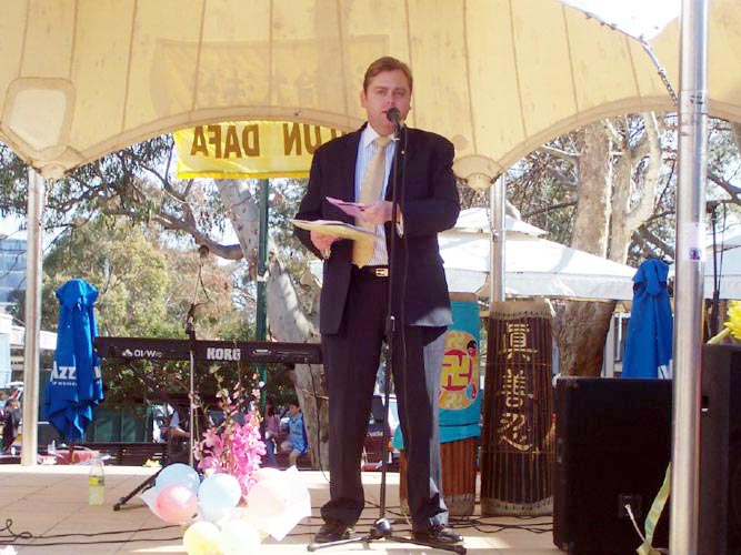 西人学员乔治森.索罗门(Jonathan Solomon)代表法轮功学员向到场的嘉宾们表示了诚挚的谢意。小弟子向各位嘉宾献上了鲜花。