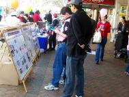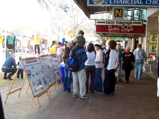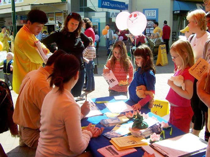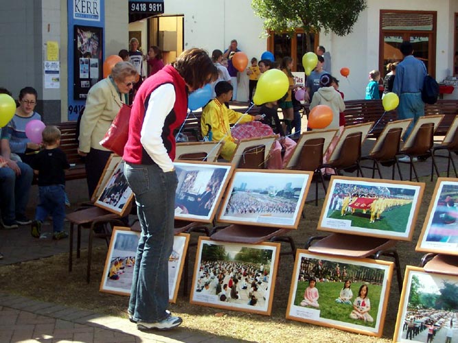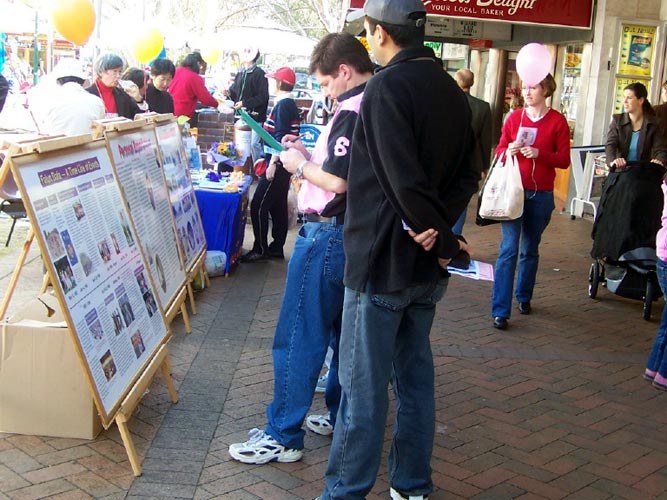 学员在广场周围同时设立了真象资料桌,并向市民征签。许多人前来拿资料和签名,并要求参加即将举行的免费教功班。一位女士拿走了许多份资料,她表示要发给她的亲朋和更多的人,她希望能做更多的事、给予法轮功学员更多的帮助。