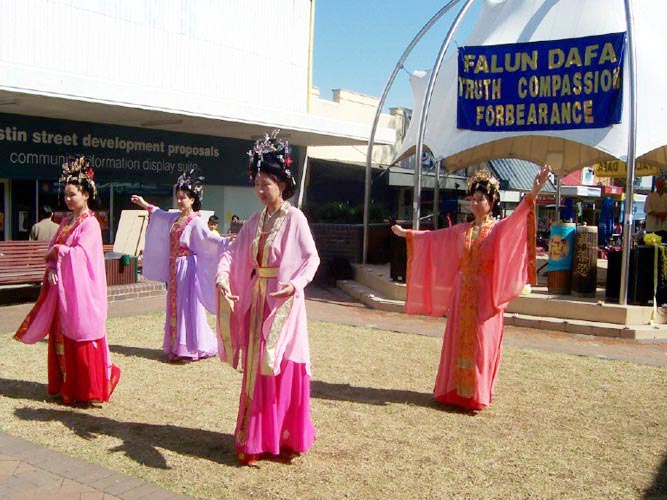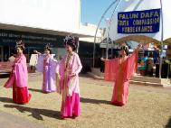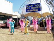 午后,学员于中心广场举行了表演庆祝活动。学员向观众演示了法轮大法五套功法,舒缓的动作伴着柔和的音乐展现着大法的祥和美好。唐服表演《万古天门开》,其气势磅礴的音乐和学员优美端庄的舞姿深受观众喜爱。4名来自明慧学校的小弟子跳了《小星星》舞,粉色的衣裙映衬着她们亲切纯真的笑容深深的感染着在场的人们。西人学员乐团演奏并演唱了多首大法乐曲和歌曲,悠扬的歌声中寄述着他们的诚意,令人深受感动。