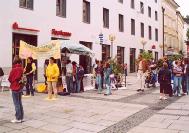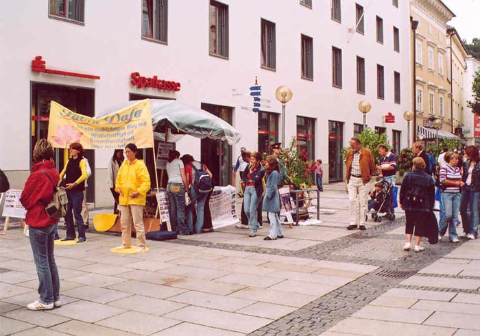 帕索和中国广西柳州是姐妹城市,当地的居民对中国的事情很感兴趣,但对大法在中国受迫害的情况了解的很有限。2004年8月21日,帕索的法轮大法弟子在市中心举办了反酷刑展,周边城市慕尼黑(Muenchen)、累根斯堡(Regensburg)和卡姆(Cham)的学员也赶来支援。从早上开始,方圆几百公里内雨就一直下个不停,待到我们的展位摆到街头时,雨下得更大了,给我们炼功、发资料带来很大困难,反酷刑展一时无法演示。后来我们改成每半小时发一次正念,清除另外空间邪恶因素的干扰,然后炼一套功法,两遍下来,雨就停了。