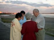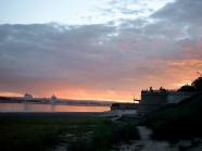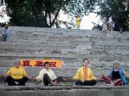 晚上我们来到布市阿穆尔河(黑龙江)轮船码头,对面就是中国黑河口岸,晚上成群的人来江边散步。我们开始在江边石阶下的一块平地炼第五套功法,然后开始发正念,两位学员在路边发真象资料。可能是在布拉格维申斯克市第一次有法轮大法弟子在公开地方炼功,而且又是在离中国只有一河之隔的江边,我们在炼第五套功法时候出奇的腿痛,一学员出现象发烧一样的状态,我们意识到这是干扰,便开始集体发正念,这样过了10多分钟情况才好转过来,连天上的云彩都好像有感应似的。很多过路人围着我们询问炼功情况,其中有兄弟两人特别感兴趣,并感受到了我们炼功时候的能量场,表示想学功,我们交换了电话并约定给他们送法轮大法书和教功光盘等资料。