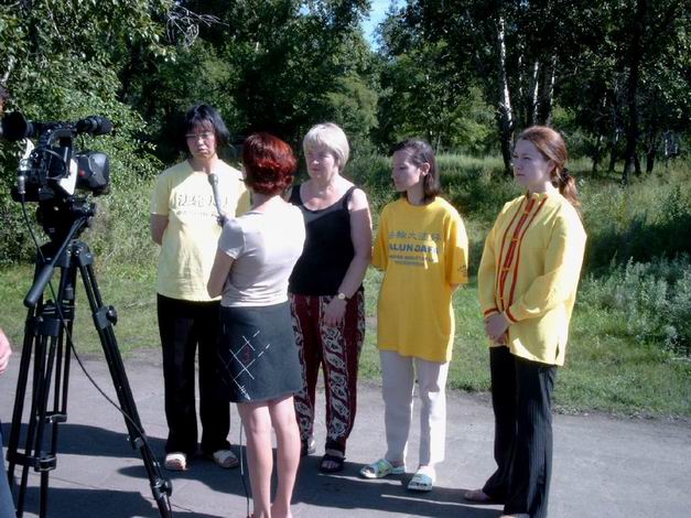 8月9日我们早早就起来集体炼功,而后就在我们邻近的电视台门前等候,我们向电视台的节目负责人说明了来意,告诉了他们我们分别是从各个城市很远的路途来到布市的,目地是为了向人们讲明法轮大法的真象,因为这里离中国边境很近,又受到经济因素的影响,所以中国江氏集团为法轮功镇压而制造的一些谎言也都渗透到了布市,布市的老百姓也被中国媒体诬陷法轮功的谎言所欺骗,而我们是想告诉布市的人民法轮大法好,揭露中国江氏集团针对法轮功散布的谎言。听了我们讲真象后,负责人马上派了记者和摄影师采访我们,在离电视台不远的公园里拍下了我们集体炼功的场面并采访了学员,学员在采访中介绍了通过修炼法轮大法后的自己身体健康和精神道德提升的经历,并回答了记者关于法轮功为什么会无辜在中国遭受镇压的问题。这次采访在当日的晚间新闻节目中播出。
