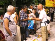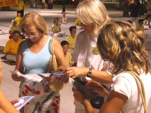 法轮功学员们分送各语种的简介,由于说着不同语种的人们提出问题,因此到处可见各语种的小组讨论。群众花很长时间仔细阅读展板上的真象信息,并且拿了所有的信息材料以了解更多的真象。他们都明白了法轮大法是古老的传统修炼功法,修炼者遵循“真、善、忍”的法理,以及在中国由于中国前国家主席的妒嫉而对法轮功展开的迫害已持续五年了。