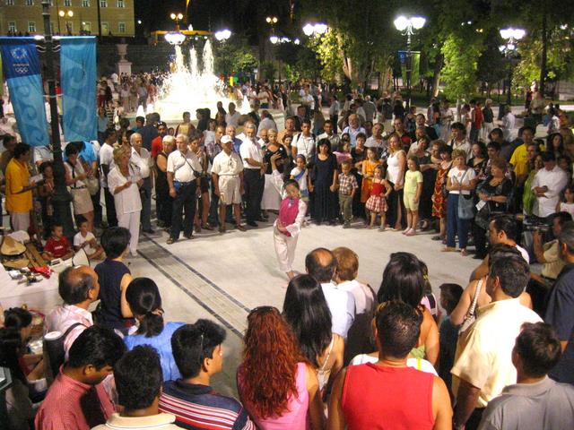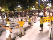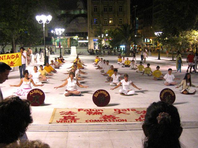 希腊的夏天极为炎热,因此在傍晚气温较为下降的时候,观光客才会外出用餐并且到处逛逛,法轮大法学员也是利用傍晚时分在雅典市的各个区域洪扬法轮大法。由于奥林匹克运动会正在雅典市進行,因此市区充满来自全球各国的人,雅典市中心广场是洪扬法轮功的好场所,因为许多人都会经过那里。