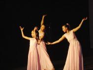 风格的独特和舒缓优雅的舞姿步伐令观众连连赞叹并掌声不绝。富丽多彩的唐服表演展现了高贵典雅的古朴神韵;欢快吉祥的扇舞表演在歌曲“法轮大法好”的伴奏下让观众沉浸在如意祥和的氛围中;而在乐曲“普度”中缓慢舒展行舞的莲花舞则导引观众领略了圣洁境界的美好纯正。