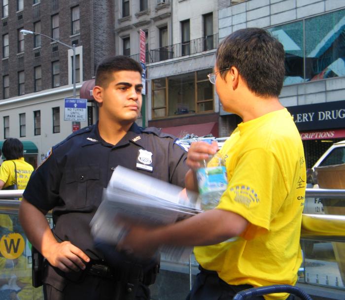 2、纽约人很多,尤其是这几天,而且到处都是警察。我们德州学员一组,在时代广场最繁华的地方发真象资料。开始时,路上的行人没有多少人注意我们。人如潮水,却对我们视而不见。我们开始发正念,并且拉起了横幅、几位学员开始炼功。图片、横幅、优美的炼功动作、祥和的炼功音乐,吸引了行人的注意,很多人都过来看。我们更加体会到了整体配合的力量。我们祥和的场和周围示威的诸多群体形成鲜明的对比。警察对我们也格外的好。