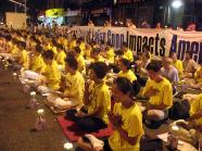 总共约千名学员参加了烛光守夜,千盏烛光于夜色中遥相呼应,气势庄严肃穆而又不乏温馨。学员们大都衣着黄色T恤,整齐的排列着,或炼功,或发正念,一切显得是如此的平和而坚定。