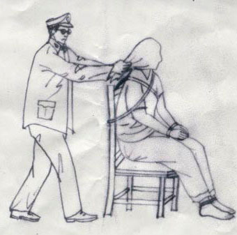 (二) 一个警察站在大法弟子后面用皮带将头勒住,警察在后面拽住不让动,另一个警察用笤帚梢往大法弟子的鼻孔里放,使鼻子痒,还不能动。