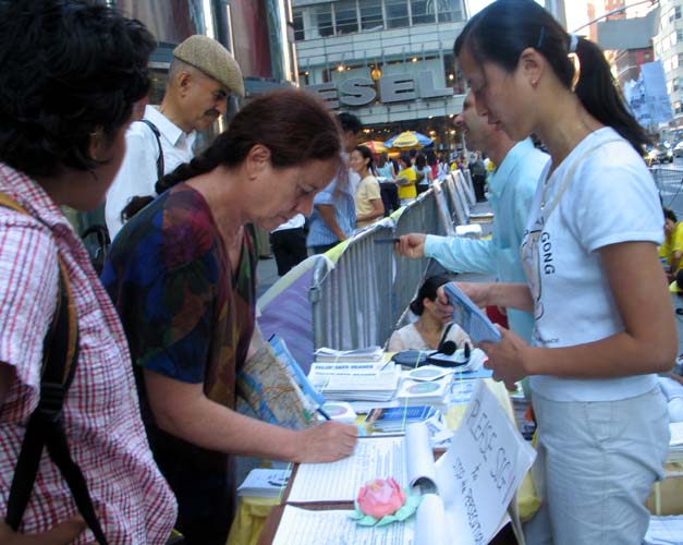 我们为什么要到纽约来呢?就是说,纽约呢,它这个,在世界上来说,它也是一个很大的一个中心城市,那么纽约人呢,他当然对世界的影响也是很大的。我们觉得就很有必要让纽约人能够明白这件事情,究竟在中国发生的什么。很多人,他们看了我们的这个flyer[传单]以后,很吃惊,他第一天拿了之后,看了,第二天见到我们的时候,他会来说:“我看了以后我才知道,这些东西是现在正在发生的呀!”就是说他们本来是不知道的,我们要是不告诉他们他们就不知道。我们能够告诉他们,能够让他们心里明白的话呢,我们当然也希望更多的人能够来支持我们,那么这场迫害呢也能够早一天结束。