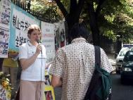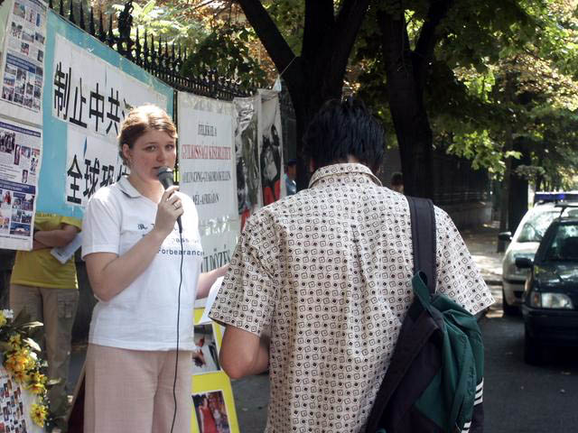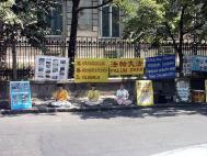 多位路人取走了法轮功真象材料,有些人驻足与学员交谈。一位女士在看到中使馆的胆怯反应时感到吃惊。又高又重的铁栏将整个中使馆四周围了起来。一名单车骑士大声说:“法轮大法好!听到了吗?终止这场迫害!”他也说法轮功学员在中使馆前举行活动是很重要的一件事,并鼓励学员持续请愿。