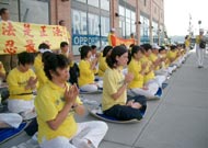为了庆祝加拿大传统节,卡尔加里法轮功学员来到斯特拉丝摩镇参加了一年一度的盛大游行,得到了当地居民和游客的欢迎和青睐。负责资料的法轮功学员给两侧的观众散发法轮功真象传单和光盘。游行结束后,部分法轮功学员继续在市中心广场前,设展板、发传单并演示功法。