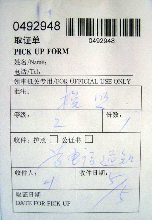 2003年的5月5日,因为我的中国护照页满,需要加页,我去中国驻丹麦大使馆办理护照加页事宜。按规定填写了表格并提供了所需一切文件,使馆工作人员给我开具了受理收据,但未写明取照的日期(按规定10天),而在那栏写下了“电话通知”。我问他为什么时,他回答说只能这样。