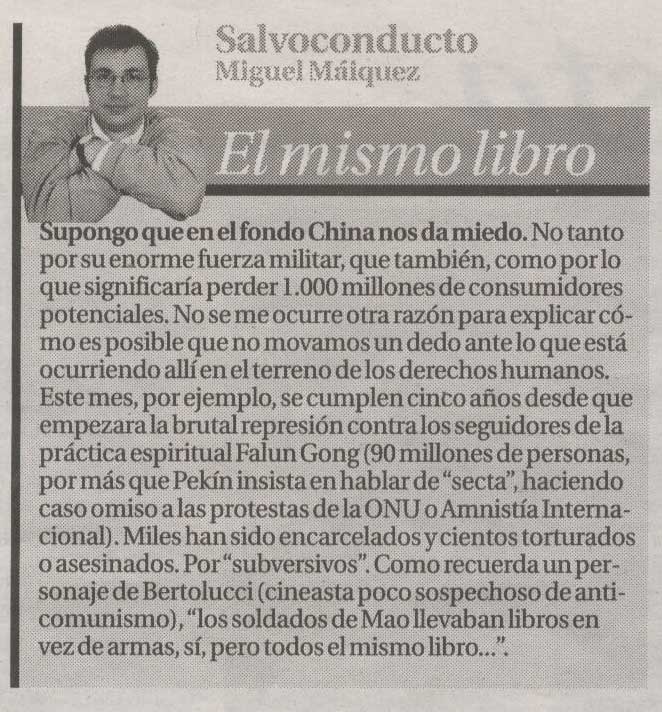 中国对于大家来说总是有一些令人恐惧,不仅是因为它强大的军事力量,在经济领域它更可以依靠所拥有的13亿消费者而为所欲为,在人权方面它更是令人毛骨悚然。就比如说,这个月就是中国政府(江氏集团)对法轮功精神团体成员大规模镇压迫害的第五个年头了。法轮功是一个传统的修炼方法,仅在中国就有9千万人修炼。然而,不顾联合国或是国际大赦等人权组织的强烈抗议,北京(江氏)当局仍坚持宣称法轮功是“×教”从而为此镇压辩护。