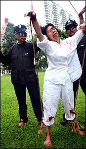 记者说,在波士顿公共广场的这些触目惊心的场面是描述中国(江氏集团)对法轮大法弟子使用野蛮酷刑手段展览的一部分。法轮大法,或称法轮功,是打坐修炼功法。