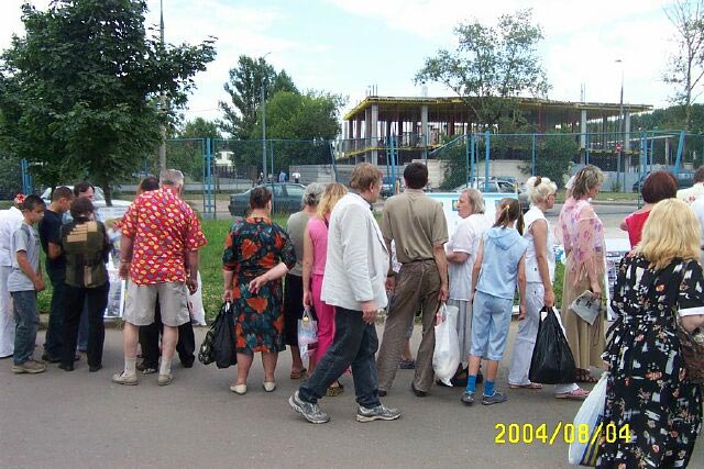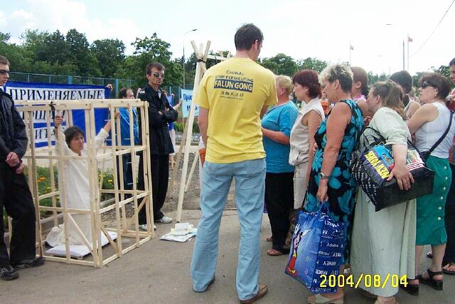 8月4日来自俄罗斯各地和乌克兰、拉脱维亚的法轮功学员在莫斯科市最大的贸易市场——“依兹麦依洛娃”市场举行了“正在中国发生的对法轮大法学员的迫害真象图片展和真人模拟酷刑展”。
