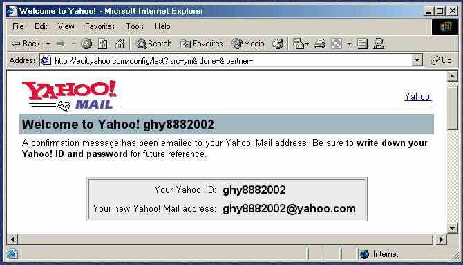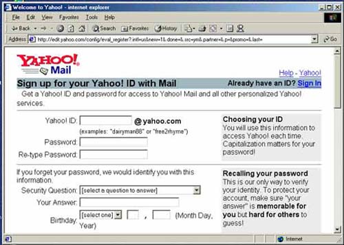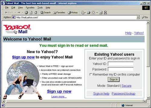 海外有大量的免费电子邮件服务,搜索一下“free email”就可以找到许多。台湾的电子邮件服务是一种方式,海外也有一些有中文的电子邮件服务。但是需要提醒您的是,yahoo.com.cn的服务器在中国,服务也是遵守中国的有关法律的……。而yahoo.com,hotmail.com,msn.com,mail.com,usa.com,email.com,等,由于与中国有合作关系,所以大法弟子不要用。海外华人背景的服务也要小心。如果您是敏感人物,至少要采用不断换地址的办法。这里仅以mail.yahoo.com为例(请不要用Yahoo的邮箱),为您介绍一下如何在英文网站上申请电子邮件帐号。